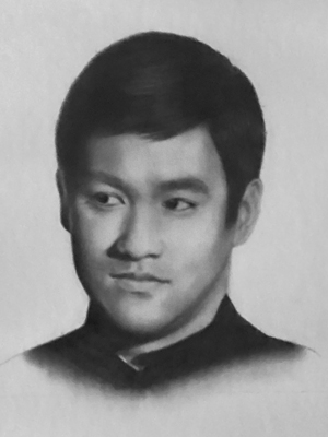 Hand-drawn pencil and airbrush illustration of actor/martial artist Bruce Lee...